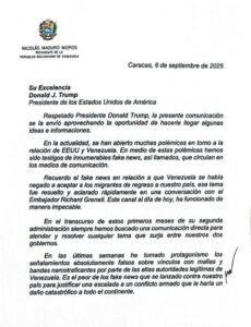 📍 La carta de Maduro, enviada días después de que Trump anunciara nuevos ataques militares contra embarcaciones de narcotráfico en el Caribe vinculadas a Venezuela, buscaba establecer “diálogo, entendimiento y respeto mutuo”.